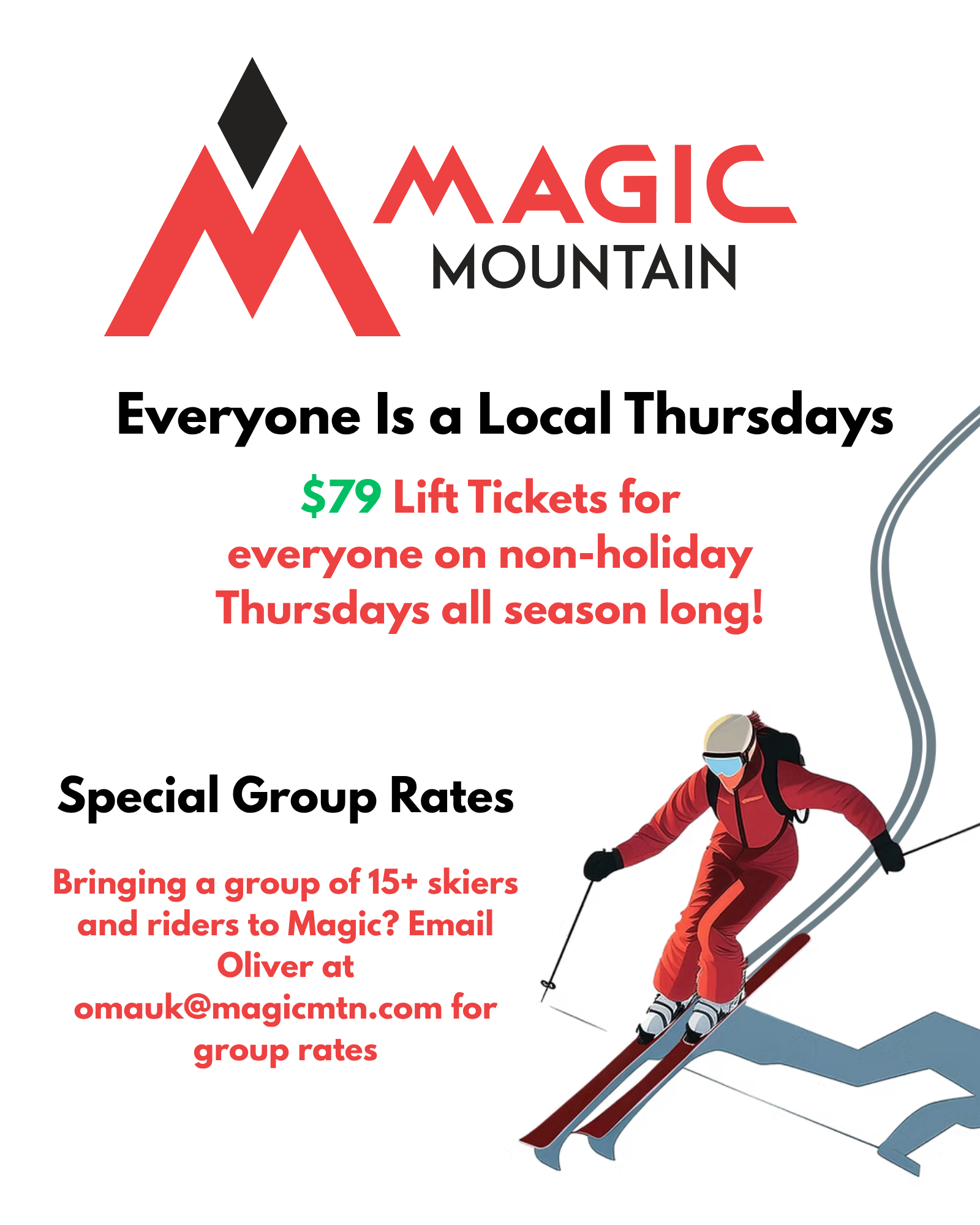 MAGIC MOUNTAIN Thursdays are discounted ski days at Magic Mountain. See the attached brochure: Magic Mountain